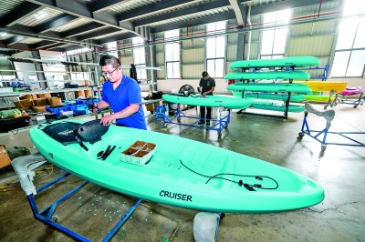 浙江慈溪某公司车间内,工人在加工出口的皮划艇。新华社发
