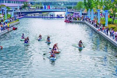 江苏省苏州工业园区趣味桨板挑战赛吸引近百组家庭报名参赛。 张锋摄/光明图片