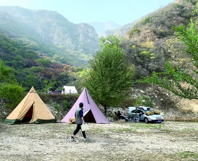 在北京郊区露营地,露营爱好者支起帐篷享受美丽秋色。周潜之摄/光明图片